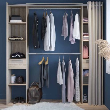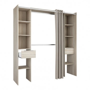 Atención personalizadaAmplio vestidor Dana para dormitorios de matrimonio en color roble shannon. Fabricado en melamina de alta calidad, este armario vestidor te permitirá guardar toda tu ropa y la de tu pareja en un mismo lugar pero de manera diferenciada, gracias a sus dos columnas con un cajón y cinco estantes cada una y a sus dos barras, las cuales podrás ajustar en anchura cortándolas durante el proceso de montaje (entre 115 y 190 cm). Los huecos inferiores al no tener base, son perfectos para guardar calzado, por lo que podrás almacenar todo tipo de prendas en el. Además, incluye una cortina de poliéster. ¡Si buscas una manera distinta para guardar toda tu ropa ¡el vestidor Dana es el tuyo!. Encuentra aquí todos nuestros vestidores y armarios abiertos.