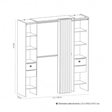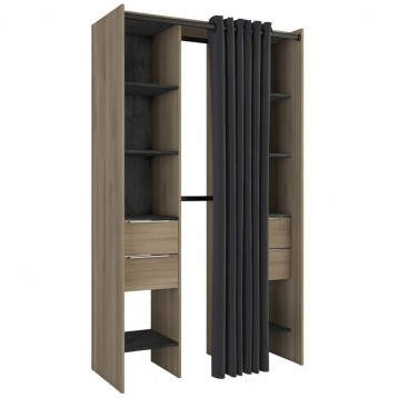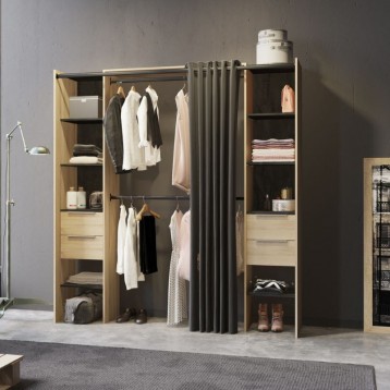 Atención personalizadaModerno vestidor Dana con cortina de algodón en color negro fabricado en melamina de alta calidad. Su estilo industrial marcado por la combinación de los colores kronberg y sidewalk, darán a tu habitación un toque innovador y original a la vez que le añades espacio almacenaje, ya que este mueble dispone de dos columnas con 2 cajones y 5 estantes cada una para que guardes desde ropa a calzado o complementos. Este armario abierto, también dispone de dos barras extensibles las cuales podrás regular entre los 115 y 190 cm cortándolas durante el proceso de montaje. ¡Añade un toque industrial a tu dormitorio con el vestidor Dana!. Encuentra aquí todos nuestros vestidores y armarios abiertos.