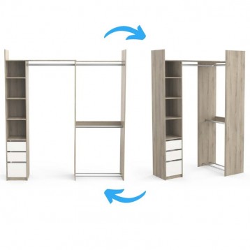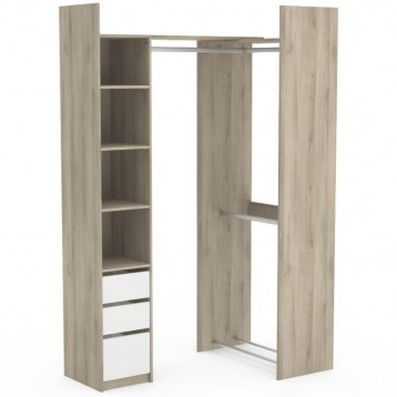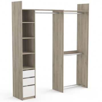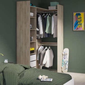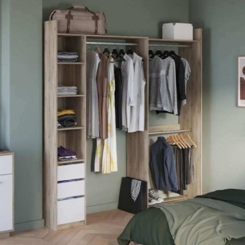 Atención personalizadaEste espectacular vestidor Swing fabricado en melamina de alta calidad y acabado en color roble Kronberg y blanco mate, se adaptará perfectamente a tus necesidades, ya que ofrece dos posiciones: frontal o esquinero (podrás decidir cuál prefieres durante el montaje). El vestidor Swing cuenta con un total de tres barras para colgar, lo que hará que dispongas de una buena capacidad de almacenaje para guardar tus prendas. Además, dispone de un total de tres cajones sobre guías correderas de bolas, siendo el inferior de mayores dimensiones. También incluye tres estantes ajustables a tres niveles distintos, para que puedas elegir la altura que prefieras. No tendrás que preocuparte por el almacenaje de tus zapatos, ya que en la parte inferior incluye dos barras de soporte a modo de zapatero donde podrás colocarlos para tenerlos siempre a mano. La combinación de sus dos colores, aportará a la estancia un toque moderno gracias a su estilo fresco y escandinavo. ¡No te lo pienses más y añade el vestidor Swing al carrito!. Encuentra aquí todos nuestros vestidores y armarios abiertos.