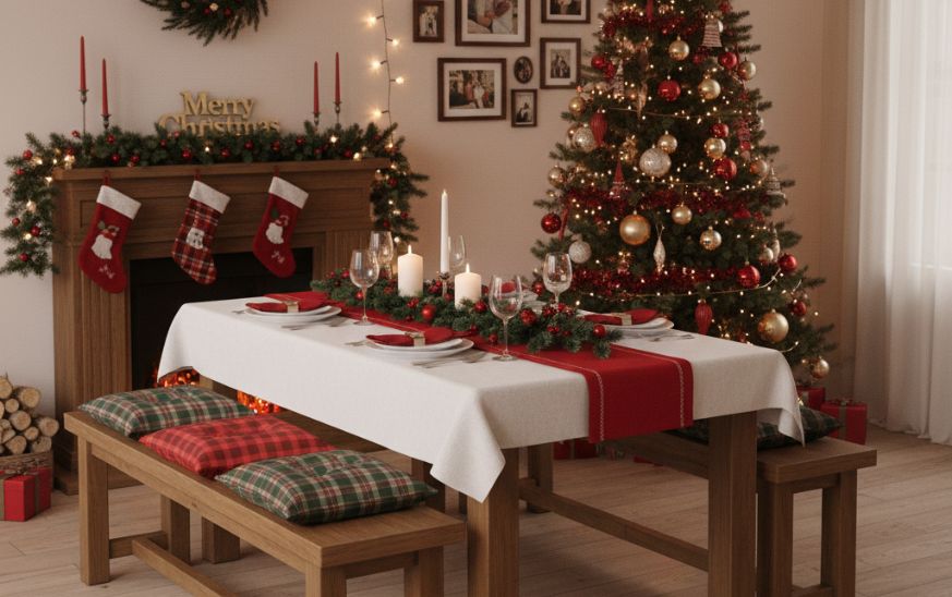 Usando elementos que ya tienes: vajilla, textiles neutros, adornos del árbol, luces LED o velas.