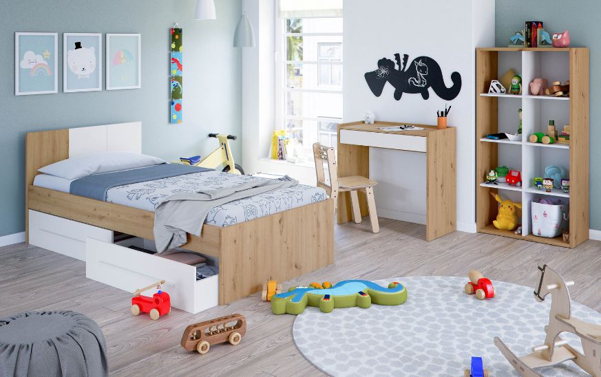 Una buena opción es apostar por camas juveniles funcionales que incluyan almacenaje, como modelos con cajones o estructuras compactas. Por ejemplo, una cama con almacenaje integrado permite mantener el orden sin necesidad de añadir más muebles.