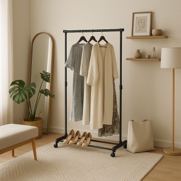 Atención personalizadaDescubre la practicidad en tu dormitorio con el burro de ropa negro, ideal para mantener ordenadas tus prendas. Este perchero de metal es una solución eficiente para organizar tu ropa diaria en cualquier habitación de tu hogar. Gracias a sus ruedas, es fácil de mover y reubicar según tus necesidades, permitiéndote cambiar la disposición de tu espacio sin esfuerzo. Su diseño incluye 2 barras inferiores perfectas para colocar tus zapatos, aprovechando así el espacio al máximo y manteniendo tus zapatos perfectamente organizados y al alcance de la mano. La estructura de este burro es completamente de metal, garantizando un soporte adecuado para varias prendas. Su acabado en color negro lo hace compatible con cualquier decoración, añadiendo un toque moderno y coordinado. Con una capacidad para combinar con diferentes tipos de almacenamiento, este burro de ropa se adapta tanto a dormitorios de matrimonio como a espacios más reducidos. ¡Añade organización y a tu carrito!