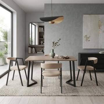 El juego de comedor Bergam con mesa en color roble y 4 sillas en tono beige está pensado para acompañar ese tipo de escenas cotidianas que hacen hogar. Su diseño minimalista aporta un toque elegante y fácil de integrar en diferentes estilos de comedor o salón, creando un ambiente cálido y acogedor donde compartir tiempo con familia o amigos. La superficie de la mesa está fabricada en melamina de fácil limpieza, combinada con una estructura de metal que aporta estabilidad al conjunto.