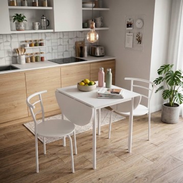 Atención personalizadaDale un giro a tu comedor con este conjunto de mesa extensible y 2 sillas ¡Moderno, luminoso y práctico! ¿Buscas una solución compacta, funcional y con estilo para tu cocina o comedor? Nuestro pack Butterfly en color blanco es justo lo que necesitas. La mesa extensible te permite ganar espacio cuando lo necesitas y ahorrar metros cuando no, perfecta para hogares con ritmo que no quieren renunciar al diseño. Fabricados con estructura metálica resistente y superficies en melamina de alta calidad, tanto la mesa como las sillas ofrecen durabilidad, estabilidad y un acabado elegante que combina con todo. El color blanco potencia la luz natural de la estancia y crea un ambiente limpio, moderno y acogedor.