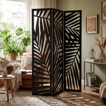Atención personalizadaEleva la estética de tu hogar con el biombo Akira en color negro. Un mueble de decoración con diseño inteligente. Este separador de 3 paneles no solo sirve para definir espacios, sino que también le da estilo a tu estancia. La estructura calada de Akira juega con la luz y la sombra, tejiendo una atmósfera de privacidad y misterio en tu entorno. Ideal para separar espacios sin sacrificar la luminosidad, Akira invita a la creatividad y a la expresión, transformando cualquier área en una galería de estilo contemporáneo. En forma de hojas aportando un estilo fresco y relajante a la estancia. Este mueble es más que un biombo; es una declaración de estilo que promete transformar cualquier habitación en un espacio lleno de personalidad y encanto. ¡Añade estilo!