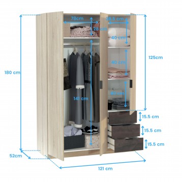 Armario (según opción) Alto 180 cm Ancho 121 cm Profundo 52 cm | Capacidad cajón: Alto 13 cm Ancho 35 cm Profundo 45 cm