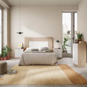 Este conjunto está fabricado en melamina y se adapta perfectamente a cualquier tipo de decoración. El color blanco mate y sahara aporta un toque de modernidad y frescura, creando un ambiente acogedor. No pierdas esta oportunidad de transformar tu dormitorio en un espacio único y especial, combinando diseño y practicidad. Es hora de completar tu dormitorio con este fantástico conjunto de muebles y conseguir el dormitorio de tus sueños. Encuentra aquí todos nuestros dormitorios de estilo nórdico y todos nuestros dormitorios de matrimonio completos aquí.
