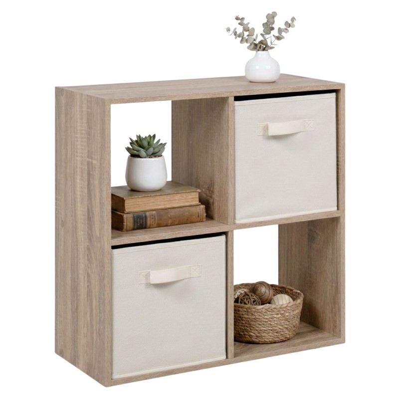 Atención personalizadaMejora el orden del salón con la Estantería Baja Abril, cuadrada. Esta estantería auxiliar pequeña ofrece una organización práctica: integra 2 huecos abiertos para acceso rápido y 2 cajones de tela para guardar lo que prefieras, desde libros hasta dispositivos electrónicos. Gracias a su formato bajo y tamaño compacto, aprovecha el espacio disponible y mantiene todo a mano. Fabricada en melamina, presenta acabado en roble sonoma y beige . Este modelo Abril prioriza el almacenamiento diario del salón con una doble solución de guardado, visible y oculto. Una opción sencilla para ordenar y tener tus imprescindibles siempre localizados. ¡Una opción ideal para tu hogar!
