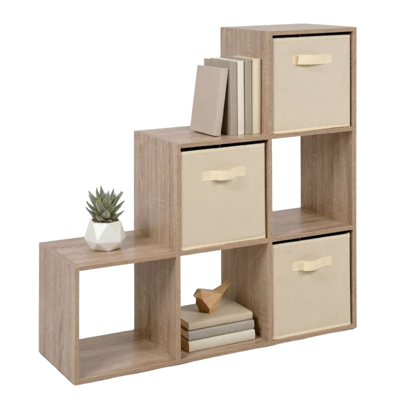 Atención personalizadaOrdena tu salón con la estantería librería escalera Abril 89x89x28 cm. Esta bonita estantería de salón con forma escalonada, optimiza el espacio y aporta almacenamiento accesible. Dispone de 3 espacios abiertos para colocar dispositivos electrónicos, libros y elementos decorativos, y 3 cajones de tela para clasificar cables, mandos y revistas. Fabricada en melamina, combina el tono madera claro roble sonoma con beige, fácil de integrar en tu hogar. Su distribución permite tener a la vista lo imprescindible y mantener el resto recogido, creando un ambiente más despejado. Un apoyo perfecto como librería o mueble auxiliar para complementar tu zona de estar. ¡Dale vida a tu salón!