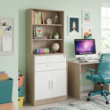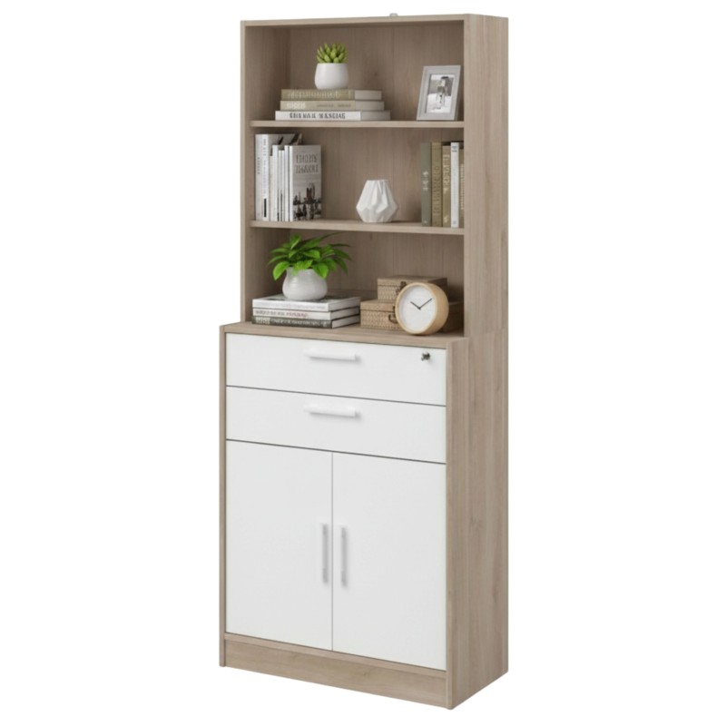 Atención personalizadaDa un giro a tu zona de trabajo con la estantería de oficina Veltis, una aliada perfecta cuando necesitas tenerlo todo bajo control: guarda dossiers que usas a diario, expone tus libros favoritos para inspirarte mientras trabajas o esconde ese caos inevitable de cables y material en sus compartimentos internos. Sus 3 estantes superiores permiten mostrar decoración o mantener a mano lo esencial, mientras que los 2 cajones y las 2 puertas abatibles te ayudan a mantener el orden cuando la jornada se intensifica. El acabado en blanco y roble japonés aporta un toque moderno que encaja tanto en oficinas profesionales como en un home office compacto. Si buscas una estantería de oficina que aproveche la verticalidad y facilite la organización sin esfuerzo, Veltis es una gran opción para transformar tu día a día. ¿Te gustaría combinarla con algún escritorio o mueble auxiliar?