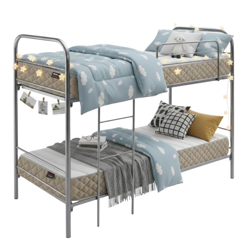 Atención personalizadaCon este pack de descanso te ofrecemos la litera ECO con dos colchones, para ahorrarte trabajo a la hora de buscas cama con colchones. Con esta litera aprovecharás el espacio de la habitación gracias a que tiene dos camas en una. Cuenta con un quitamiedos en la cama superior para mejorar la seguridad a la hora del descanso, también cuenta con una escalera para ayudar a subir. Su estructura es de tubo acerado de 30x30 cm que aportará mayor firmeza. La distancia de las camas es de 86 cm. El pack de descanso incluye dos colchones Maxi-Basic de 90x190 cm para las dos camas, para que el descanso durante el año sea confortante. Esta litera acabada en color plata combina bien con diversos colores y estilos para que se adapte al ambiente del dormitorio. ¿A qué estas esperando? ¡Añádela al carrito!. Si quieres más ideas, encuentra todas nuestras literas baratas aquí.