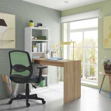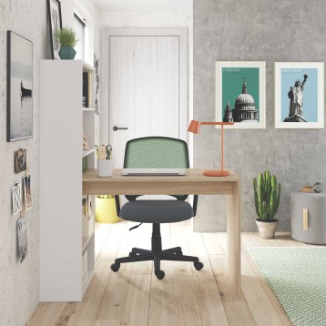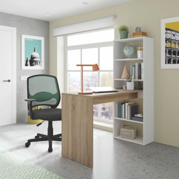 Atención personalizadaFabulosa mesa de escritorio con estantería, fabricada en melamina de alta calidad. La estantería contiene 5 espaciosos estantes en los que podrás almacenar objetos de todo tipo, como libros o cajas, y te permite decidir durante el proceso de montaje su posición según tus necesidades (izquierda o derecha). El diseño de este mueble, le otorga un aspecto peculiar, ya que la mesa está acabada en color roble canadian y la estantería en color blanco artik (mate), proporcionándole un acabado muy moderno. Este práctico escritorio es ideal para habitaciones infantiles o juveniles ¡No dudes más y hazte con este escritorio!