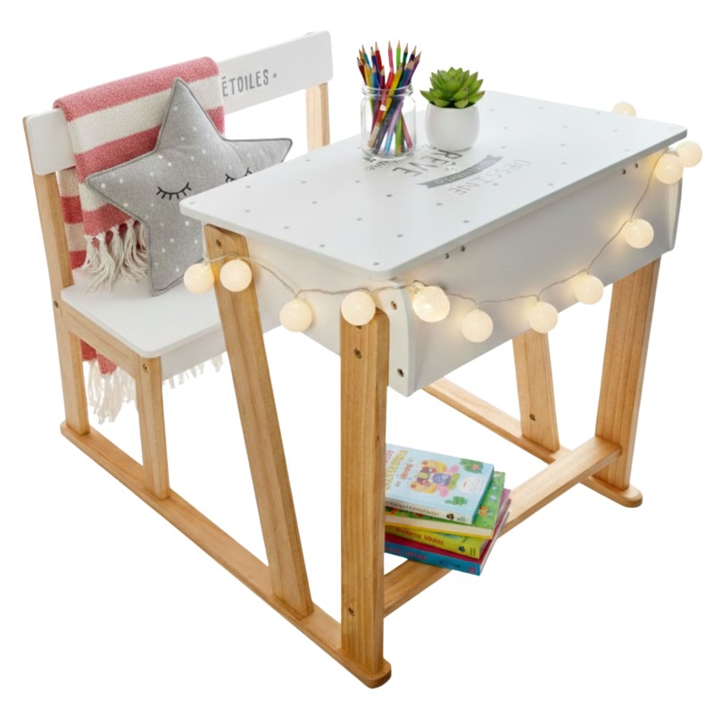 Atención personalizada¿Alguna vez has pensado en todo lo que le quieres enseñar a tu peque? Introduce a tu pequeño en el mundo del aprendizaje con el pupitre infantil con banco Écriture. Incluye integrado en la propia estructura del pupitre un banco pequeño paras sentarse mientras se divierte y aprende en el pupitre. Diseñado con una tapa abatible equipada con una bisagra hidráulica, facilitando el acceso al almacenamiento interno sin esfuerzo. Disponible en color blanco, complementado con patas color roble claro, añade un toque moderno y acogedor a cualquier habitación infantil. Fabricado en melamina este conjunto aporta funcionalidad y un espacio optimizado para acompañar a tu hijo en su jornada escolar. ¡Haz del estudio una experiencia cómoda y divertida con el pupitre infantil con banco Écriture!