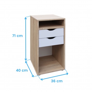 Atención personalizadaTe presentamos la mesita de noche Parc, con 2 cajones y 2 huecos, una solución práctica para optimizar el almacenamiento en cualquier rincón de tu dormitorio. Este mueble, fabricado en melamina, ofrece un diseño compacto con medidas ajustadas para así adaptarse a diversas necesidades de organización. El tablero aglomerado melamínico asegura un acabado atractivo y moderno en colores blanco y roble Sonoma, aportando un toque cálido y contemporáneo a tus espacios. Sus 2 cajones son amplios y están equipados con tiradores fresados, lo que facilita el acceso a tus objetos personales y asegura un manejo suave y sencillo. Además, las guías de rodillos de metal de cada cajón permiten una apertura y cierre eficiente. La opción adecuada para quienes buscan una solución de almacenaje compacta sin sacrificar estilo ni funcionalidad. Su versatilidad en diseño de color blanco y roble Sonoma hace que encaje perfectamente en diferentes decoraciones, aportando orden y estilo. ¡Añade este práctico mueble a tu carrito!
