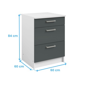 Atención personalizada¿Te falta espacio para organizar cubiertos y utensilios en tu cocina? Este módulo bajo de 60 cm con 3 cajones es una solución práctica para mantener cada accesorio en su lugar y facilitar el día a día. Su diseño permite distribuir cubiertos, trapos o pequeños utensilios de forma accesible y ordenada. Los 3 cajones incorporan tiradores en color aluminio que favorecen una apertura cómoda y fluida. Además, incluye encimera en color blanco, ideal para completar la zona de trabajo y dar continuidad al conjunto. Fabricado en melamina, combina acabado gris brillante y blanco, adaptándose a distintos estilos de muebles de cocina. Funciona como cajonera de cocina o módulo auxiliar para ampliar la capacidad de almacenaje sin renunciar a un diseño actual y funcional. ¡Directo a tu carrito!
