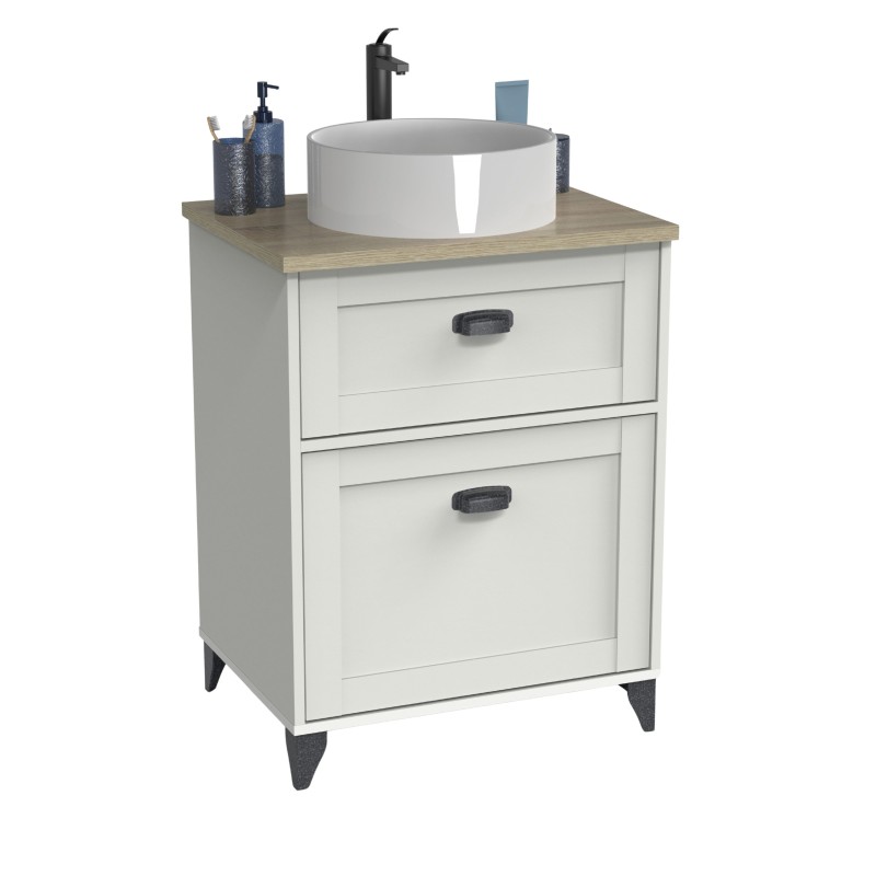 Atención personalizadaOptimiza el orden de tu baño con el mueble de lavabo Toscana 61 cm en blanco soft y superficie en roble cambrian. Sus 2 cajones con guías metálicas de cierre progresivo permiten organizar tus artículos de baño con acceso cómodo. Las patas de ABS de 9 cm brindan un buen soporte, y los tiradores negros en ABS aportan un aire actual. Fabricado en melamina, se integra a la perfección con lavabos de 60 cm. La tapa de gran grosor y las molduras distintivas en los cajones refuerzan su presencia, creando un espacio bien distribuido y visualmente armonioso. Este mueble de baño une organización y estilo natural para renovar tu aseo con un formato versátil y pensado para el uso diario. ¡Añade al carrito!