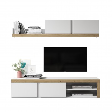 Atención personalizadaEste pack de muebles de salón en color blanco mate y roble naturale es la opción perfecta para quienes buscan renovar su hogar con estilo y un toque contemporáneo. El conjunto incluye: