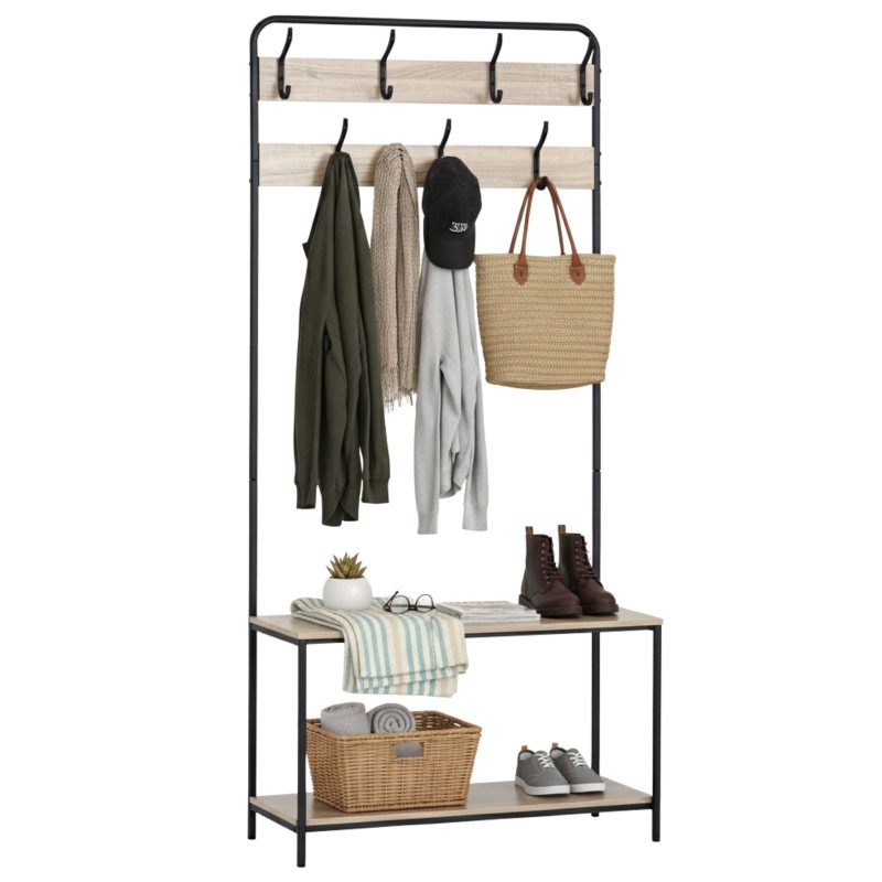 Atención personalizadaRenueva tu entrada con este perchero de entrada color roble cambrian y negro, diseñado para optimizar el espacio y la organización de tu hogar. Con unas dimensiones de 80x170x30 cm, este mueble es perfecto para situar junto a la pared, aportando orden sin ocupar demasiado espacio. Cuenta con 7 colgadores en la parte superior, ideales para colgar abrigos, bufandas o sombreros, y 2 baldas inferiores que ofrecen un espacio adicional para colocar zapatos, bolsos o cualquier otro accesorio. Fabricado en melamina y con una estructura de metal robusto, combina funcionalidad con un diseño moderno en tonos madera claro y negro. Este perchero es una opción práctica para mantener tu recibidor despejado y organizado. Añade este elemento funcional y estilizado a tu hogar hoy mismo y disfruta de su versatilidad y utilidad para tener todo a mano al entrar o salir de casa.