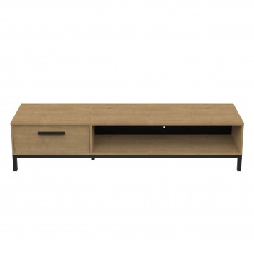 Atención personalizadaDale a tu salón un toque moderno con el mueble TV Bench. Con una longitud de 183 cm, este mueble está diseñado para maximizar el almacenamiento y mantener cada espacio ordenado. Dispone de 1 cajón de asa negra con guías de bolas, asegurando un funcionamiento suave, junto a 1 espacio abierto ideal para colocar tus dispositivos electrónicos o decoraciones favoritas. Su estructura está fabricada en melamina, garantizando una superficie limpia y cuidada. Las patas de pino macizo lacadas en negro aportan estabilidad y un contraste visual atractivo. El color roble Hamilton combinado con detalles en negro ofrece un diseño que se integra armoniosamente en ambientes contemporáneos. Este mueble no solo se enfoca en su apariencia moderna, sino también en su capacidad de adaptarse a tus necesidades de entretenimiento y almacenamiento multimedia. Añade este esencial a tu hogar y transforma tu salón en un espacio organizado y con estilo.