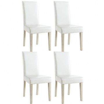 Silla Guevara, revestida con poliuretano de color blanco y con estructura y patas de madera de pino. El asiento dispone de 4 cm de espuma, y el respaldo 2 cm.