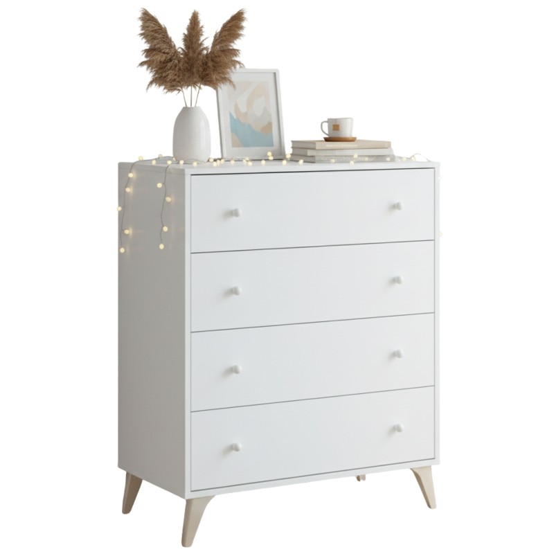 Atención personalizadaPerfecta cómoda Sweet de 4 cajones, presenta un estilo nórdico con unas líneas muy naturales que la hacen realmente bonita. Sus detalles decorativos, como los tiradores de bola y sus patas ligeramente inclinadas, hacen de está cómoda una pieza única. Su presencia en tu habitación aportará frescura y luminosidad además de ayudarte con la capacidad de almacenaje. Está fabricada con melamina de alta calidad en color blanco artik (mate), por lo que la podrás colocar en cualquier habitación, ya sea de matrimonio, individual, juvenil o infantil. Es increíble ¿no crees? Consigue cómodas y sinfonieres perfectas para tu dormitorio aquí.