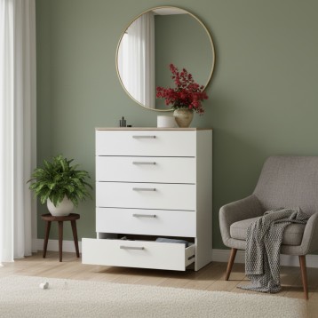 Atención personalizadaOptimiza el almacenamiento en tu hogar con la cómoda Watson, un mueble destacado por su capacidad de organización y su diseño moderno. Esta espaciosa cómoda ofrece 5 cajones que facilitan el almacenamiento eficiente de ropa, accesorios u otros objetos esenciales del hogar. Fabricada en melamina, combina la estética del color blanco mate con el toque del roble Kronberg, creando un contraste visual atractivo y versátil. El modelo Watson está diseñado para adaptarse de maravilla en tu dormitorio. Los cajones son amplios, ofreciendo un espacio ideal para mantener organizados sus pertenencias diarias. Ya sea que estés buscando renovar una habitación o simplemente añadir un mueble funcional a su espacio, la cómoda Watson es una opción que destaca por su equilibrio entre utilidad y estilo contemporáneo. ¡Moderniza tu dormitorio!