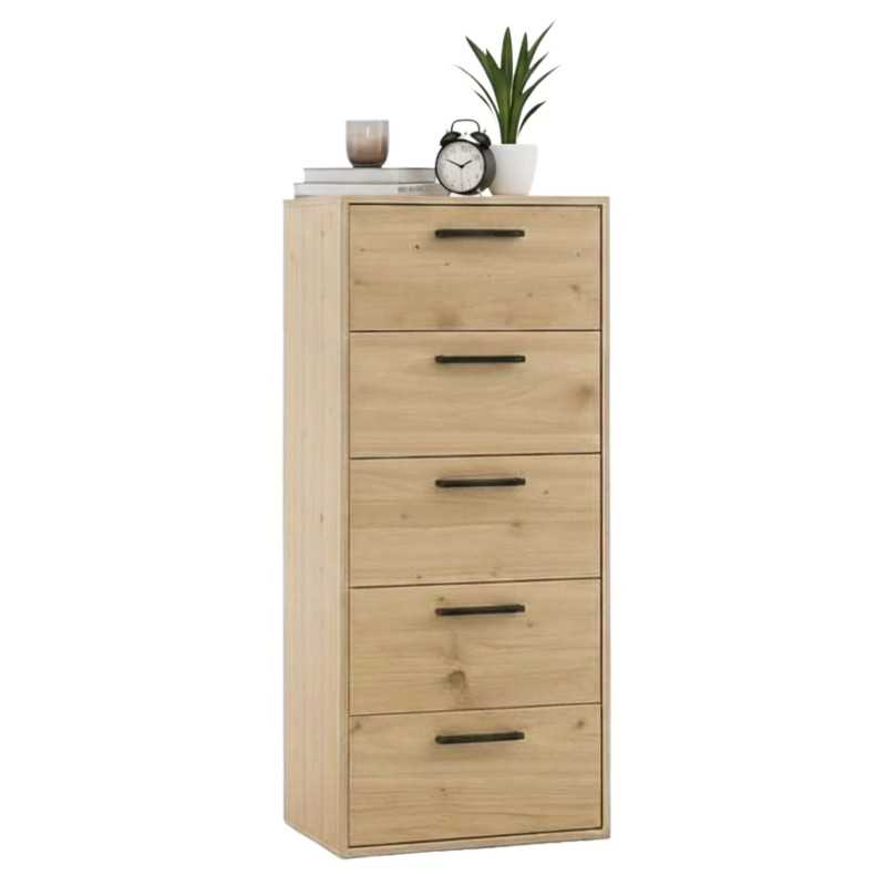 Atención personalizadaOptimiza el orden de tu dormitorio con el sinfonier de 5 cajones Rosi. Su estructura estrecha y vertical ofrece capacidad para ropa, accesorios y textil, aprovechando el espacio disponible. Fabricado en melamina, está acabado en roble artesano y cuenta con tiradores en color negro que aportan un contraste actual. El tono madera claro se integra fácilmente en diferentes ambientes. Sus 5 cajones son útiles para clasificar camisetas, ropa interior o complementos, manteniendo todo recogido y a mano. Una cajonera de dormitorio orientada al orden diario, ideal para habitaciones principales, juveniles o de invitados que buscan almacenamiento y un look industrial-moderno en melamina. ¡Añade estilo a tu dormitorio!