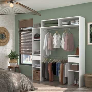 Atención personalizada¿Estas buscando un vestidor? El vestidor abierto Custom C+F en color blanco mate, es lo que estás buscando. Es hora de innovar y tener ordenado tu dormitorio. Este armario dormitorio fabricado en melamina de alta calidad, es un mueble funcional y estable. Disfruta de 3 baldas en su columna izquierda para tener tus prendas bien dobladas o darle su sitio a tus bolsos. También dispone de 2 huecos superiores para guardar tus edredones, 1 estante central y otro inferior en la parte derecha. Incluye 2 barras, una superior y otra inferior para organizar tus mejores looks en perchas y tenerlos listos para cuando los necesites. Además tiene 2 cajones que te permiten tener a mano tus pertenencias y tus mejores accesorios. Multitud de espacios para tenerlo todo a mano, así es más rápido elegir que ponerte. Si buscas más para tu estancia, añade un vestidor modular más de la colección Custom y amplia la estructura del vestidor. ¡Añade al carrito!