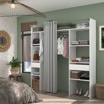 La estructura de este vestidor cuenta con 2 cajones (uno ancho y el otro más estrecho) donde colocar tu ropa intima o mantener tus accesorios organizados. Incluye 2 barras donde colgar las prendas de telas difíciles y mantenerlas sin arrugas. Con su cortina podrás resguardar tu ropa y mantenerla privada sin que entre polvo. Fabricado en melamina de alta calidad y acabado en color blanco, combina fácilmente con diferentes ambientes. Consigue una relación calidad precio increíble. Ahora puedes completar este armario abierto con los vestidores modulares Custom. Añádelo al carrito.