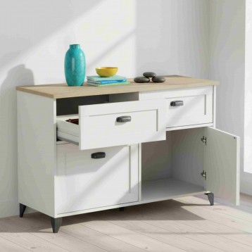 Atención personalizada¿Sabías qué pasamos más horas en el salón que durmiendo en nuestro dormitorio? ¡Empieza a disfrutar de tu estancia con el aparador Portobello! Este mueble de comedor sofisticado, con almacenaje y personalidad, ha llegado para transformar tu casa y empujarte a disfrutar de cada rincón. Un diseño, fabricado en melamina de alta calidad, que combina el color blanco soft (acabado mate) con el roble cambrian (madera claro). Posee una capa de gran grosor, guías metálicas en sus dos cajones, molduras decorativas en la parte externa de sus puertas abatibles, tiradores y patas de plástico negro ¡Se convertirá en el modelo que guiará toda tu decoración!