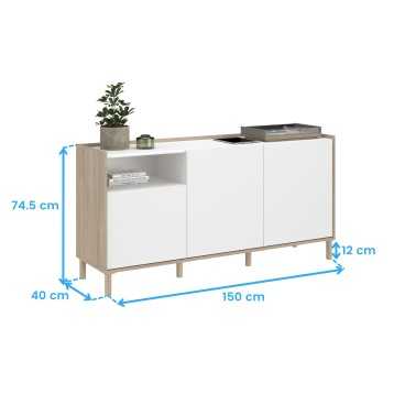 Atención personalizadaDale vida a tu espacio con el aparador Azzaro, perfectamente diseñado para adaptarse a tus necesidades de almacenamiento y organización. Este mueble está fabricado en melamina. De estilo nórdico, con su color roble japonés combinado con blanco mate, lo que le confiere un aspecto moderno y atractivo. Con este aparador, podrás optimizar el espacio en tu salón o comedor gracias a su amplio almacenamiento, ideal para guardar vajillas, accesorios o cualquier otro objeto que desees tener a mano, pero fuera de vista. El Aparador Azzaro cuenta con 3 puertas abatibles y 6 espacios en su interior, uno de ellos abierto. Este mueble se presenta como una opción más que acertada para quienes buscan utilidad sin renunciar al buen gusto. No esperes más y actualiza tu hogar con este accesorio indispensable. ¡Añádelo ya a tu carrito!
