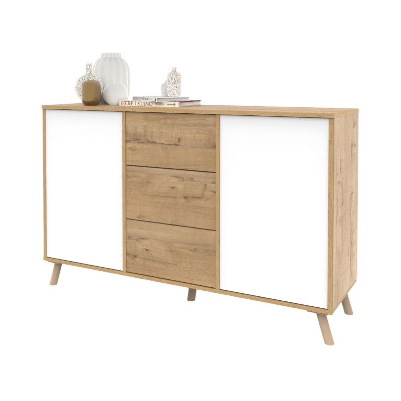 Atención personalizadaMejora tu salón del hogar con el aparador Oslo roble Gold y blanco mate. Sus 3 cajones centrales y 2 puertas permiten organizar todo tipo de objetos, manteniendo el salón o comedor siempre en orden. El sistema de apertura push en puertas y cajones ofrece un uso cómodo, ágil y sin tiradores, ideal para un manejo diario sin esfuerzo. Fabricado en melamina, es una opción práctica para quienes buscan un mueble útil y actual. De inspiración nórdica, su combinación roble Gold y blanco mate aporta un aire natural y moderno que se integra con facilidad en diferentes decoraciones, desde ambientes tradicionales hasta propuestas más vanguardistas. Añádelo para sumar orden y estilo en cualquier estancia del hogar.